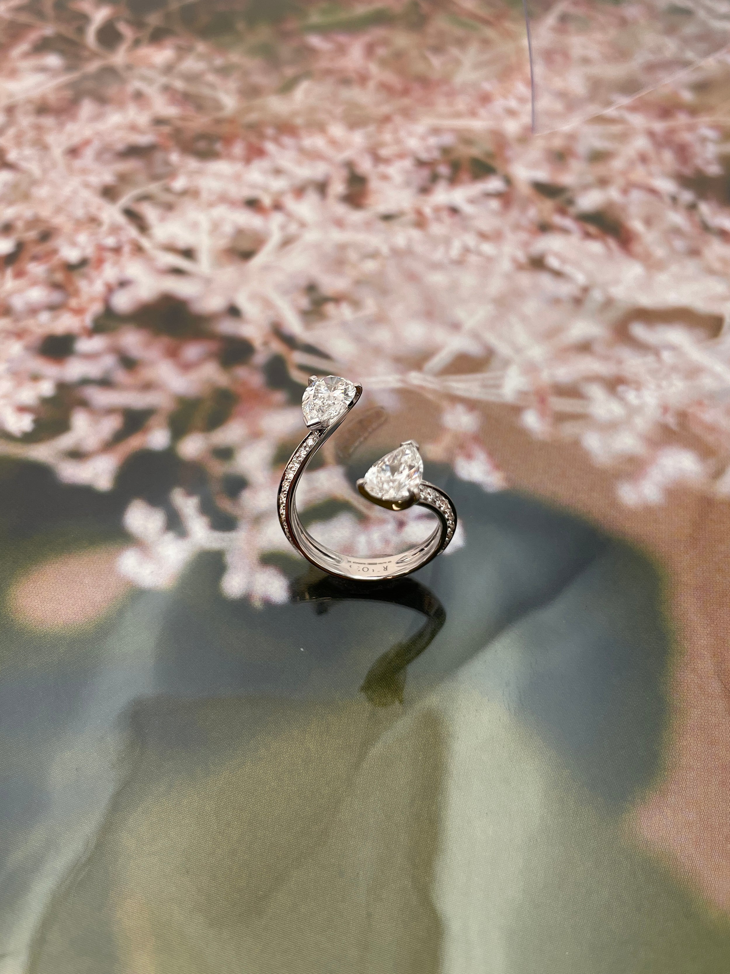 The Brevis collection is a reinvention of the "Toi & Moi" ring, a setting where two gemstones, placed opposite each other, come together to symbolize the union of two souls. The pieces in the collection showcase pear-cut gemstones, enhanced by a gold thread placed between two paved rows, forming a uniquely oriented structure. Brevis features floating diamonds, a fascinating way to wear diamonds in rings, necklaces, pendants, or bracelets, creating a delicate balance where the stones seem to levitate on the body.