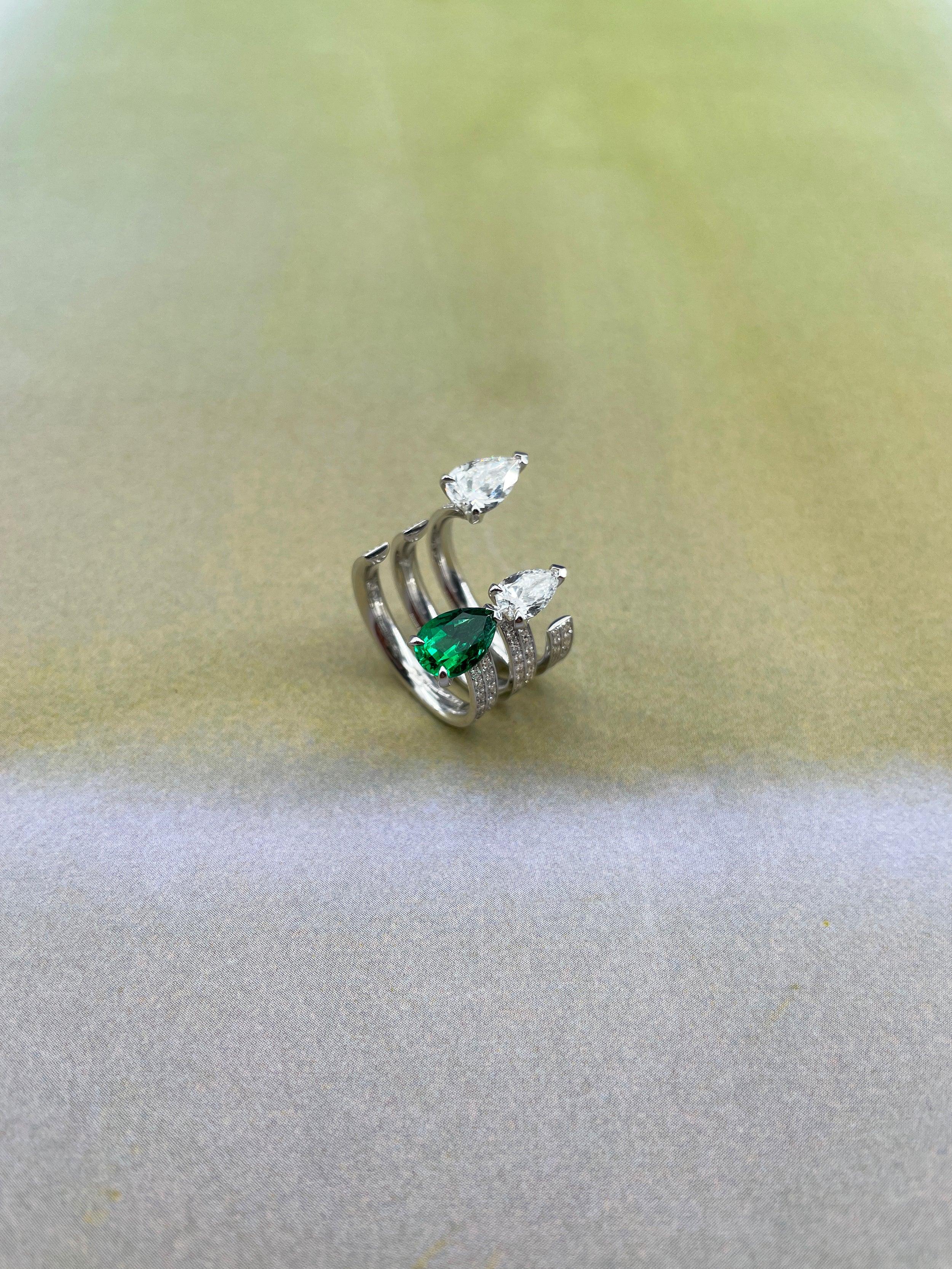 The Brevis collection is a contemporary reinvention of the "Toi & Moi" ring, featuring impressive and balanced pear-shaped gemstones enhanced by a spectacular gold thread. Each stone is meticulously hand-selected, ensuring the highest quality and a perfect match in terms of shape for a balanced and striking result. The stones are oriented to match the shape of the setting and are elevated by a unique "Eiffel Tower" setting that accentuates their lightness and brilliance, creating a visual symphony.