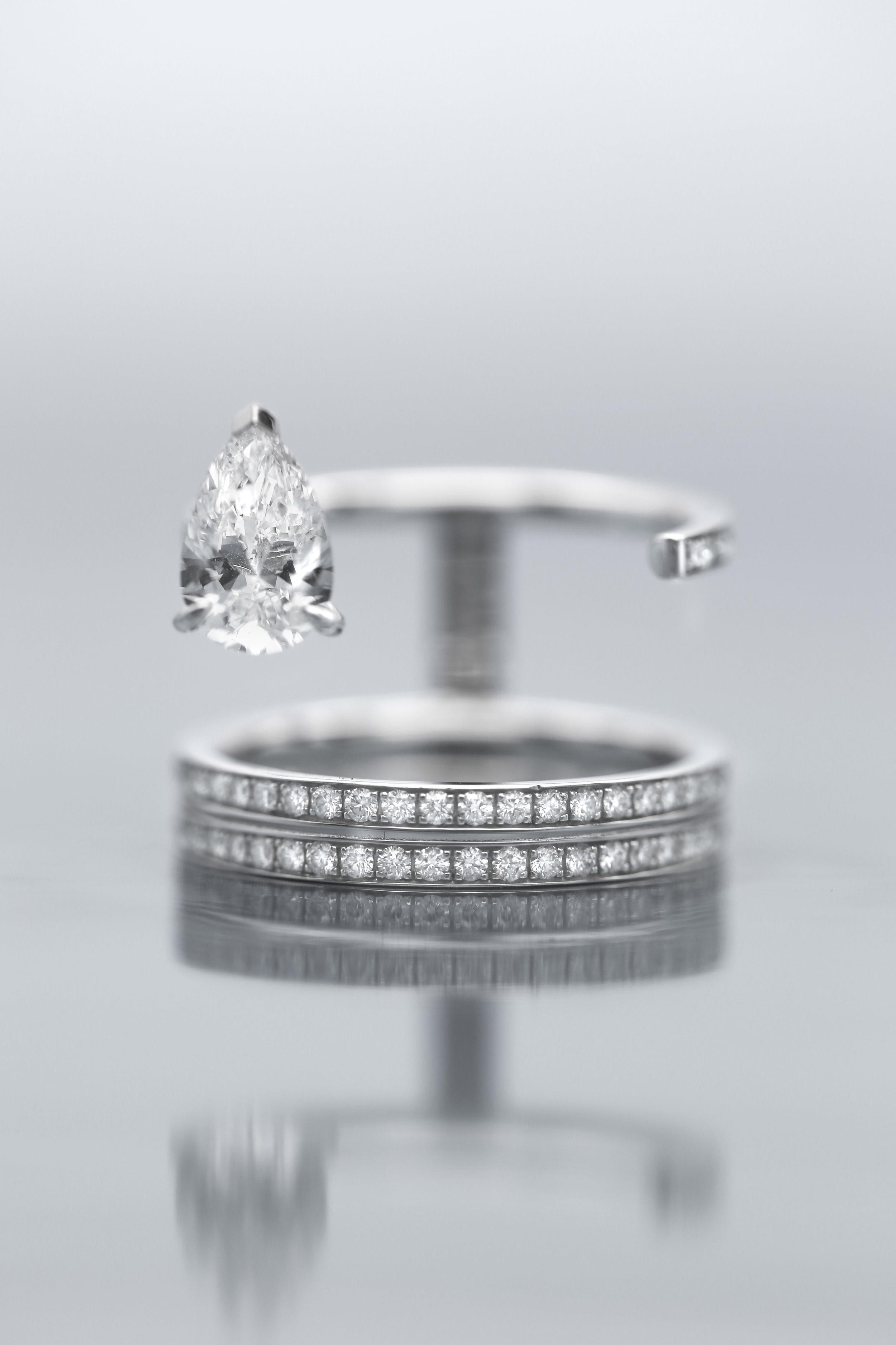 A composition in white gold of 3 pear-shaped diamonds that rests on the fingertips as if in levitation