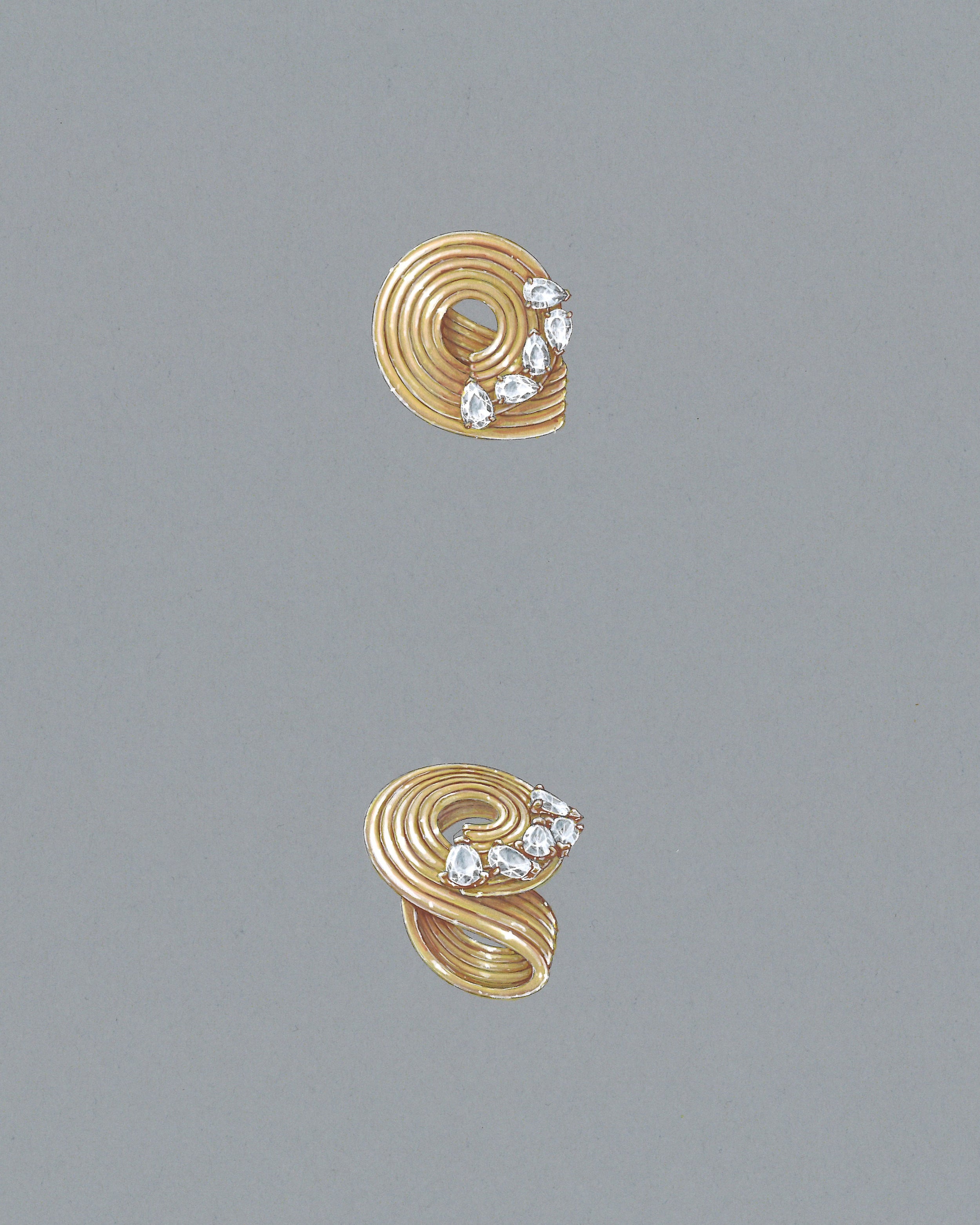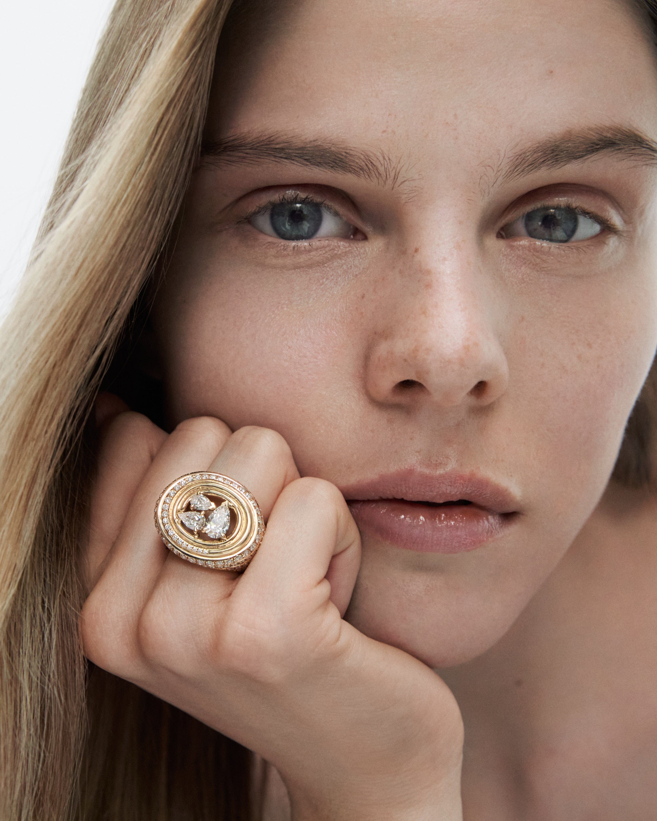 La bague Spirale est l'exemple parfait de l'approche sculpturale de la collection, composée de fils d'or avec un mouvement spécifique suivant le corps de bague jusqu'à la spirale pour un équilibre parfait du design.