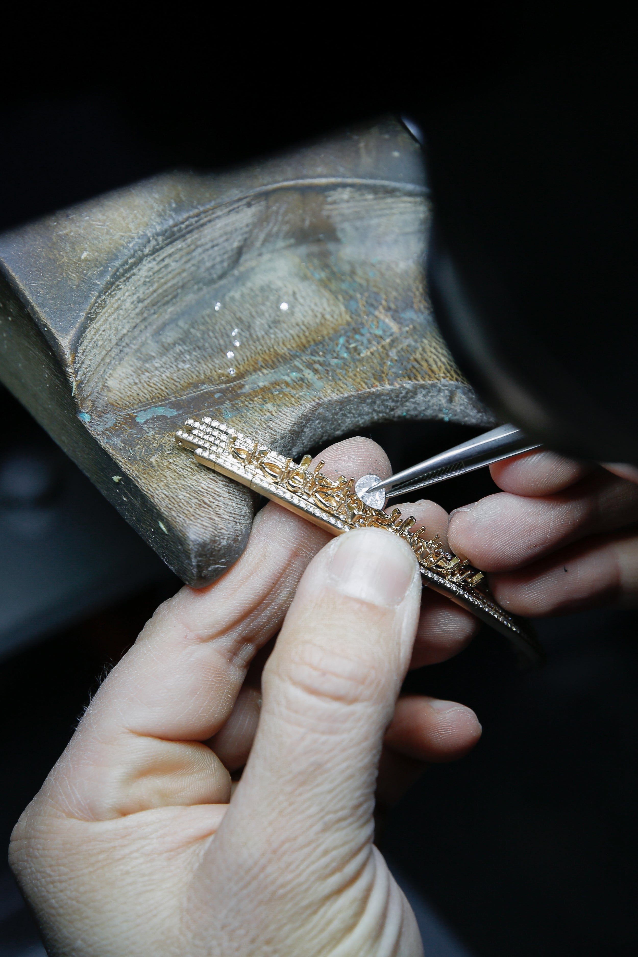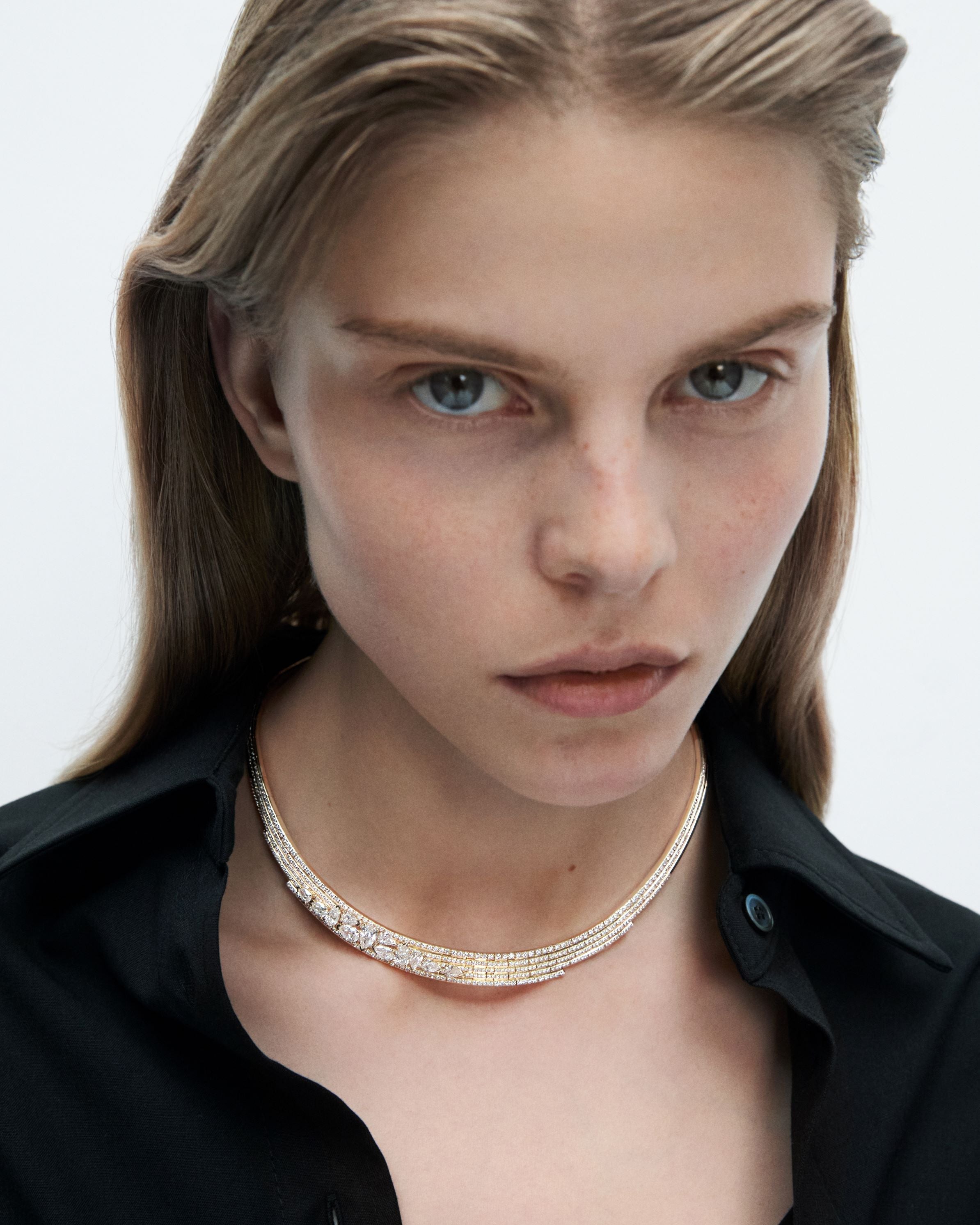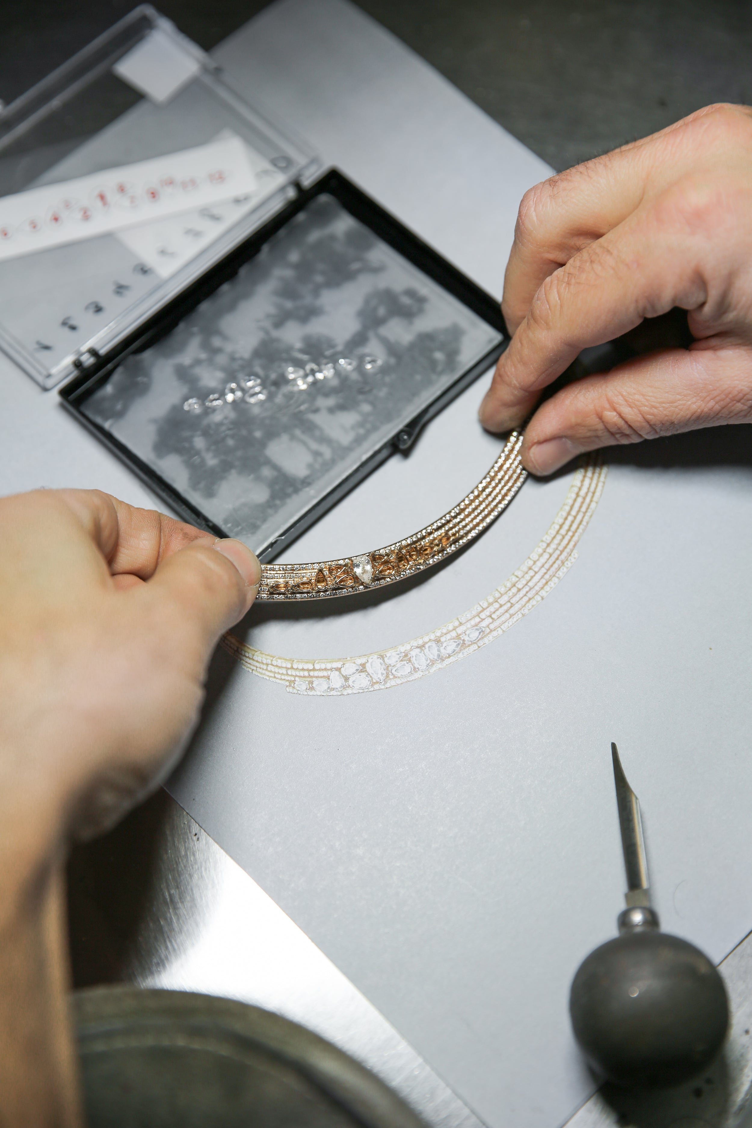 Le collier Plastron est la pièce maîtresse de la collection. Cette pièce d'exception résulte d'un processus d'assemblage méticuleux, démontrant le fil d'or caractéristique tout en assurant un confort remarquable et une tenue parfaite sur le cou. Sa création a nécessité 250 heures de travail de la part de l'atelier.