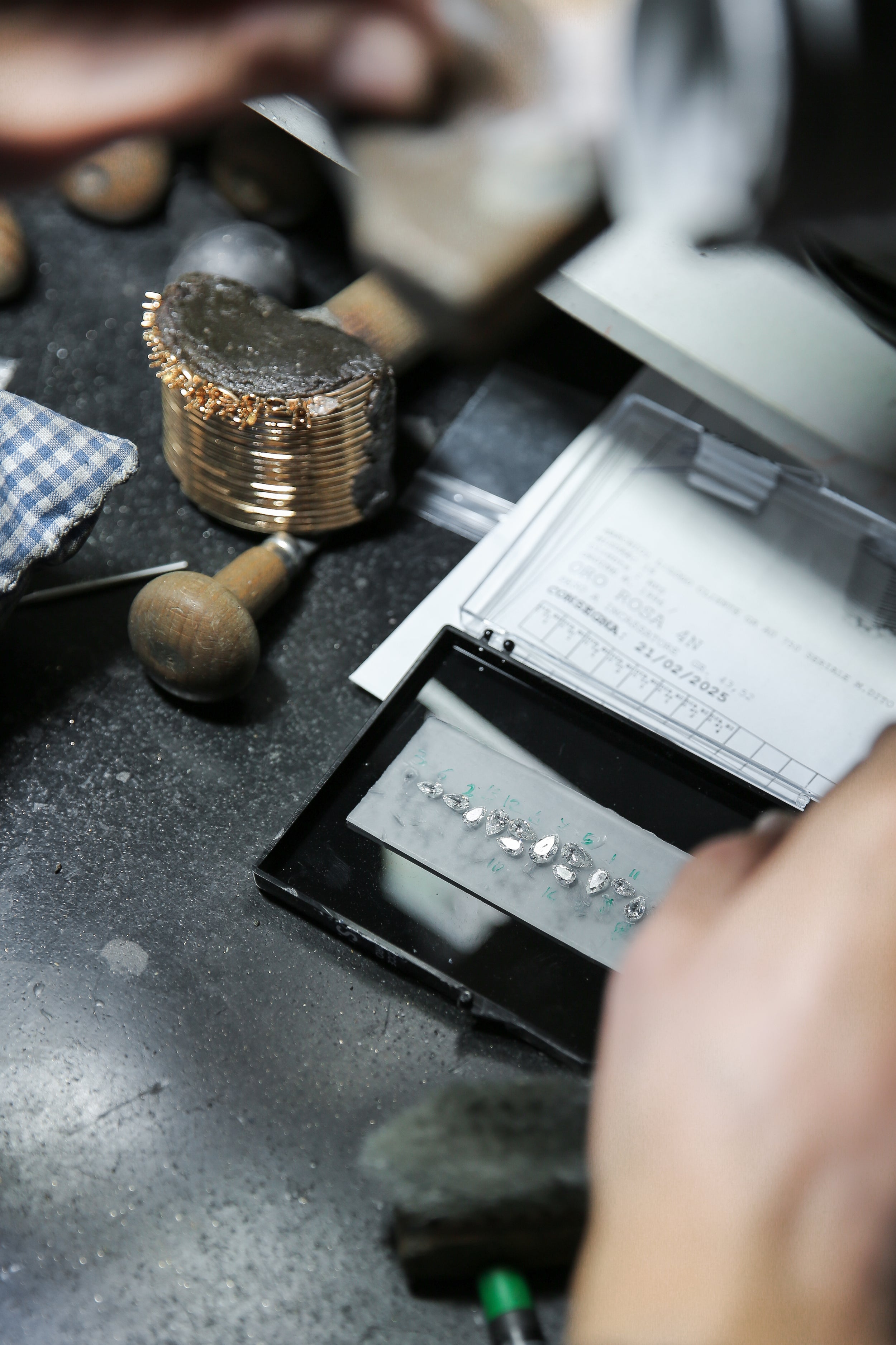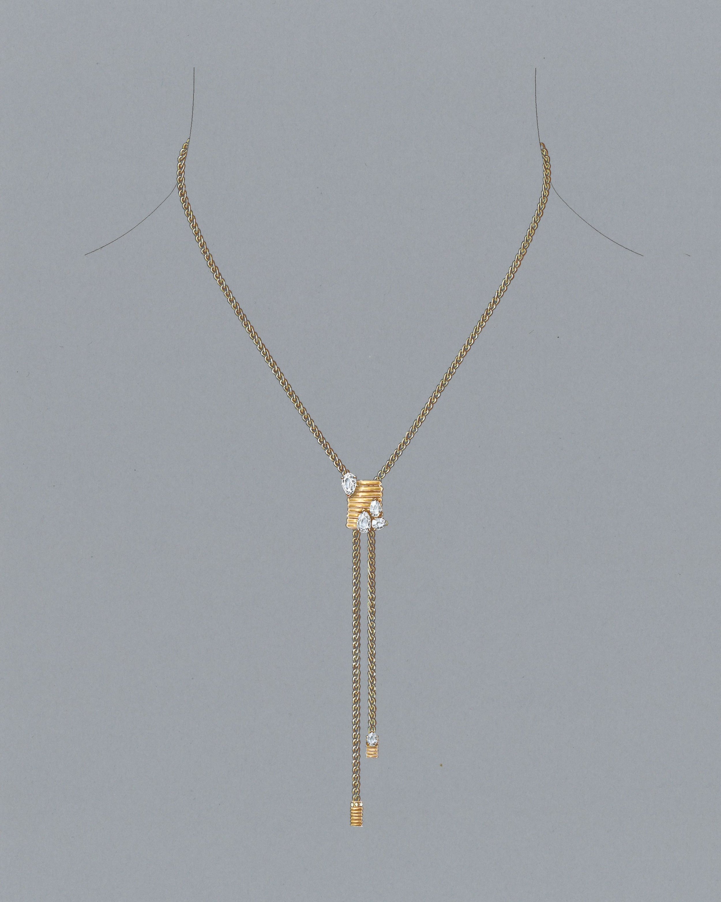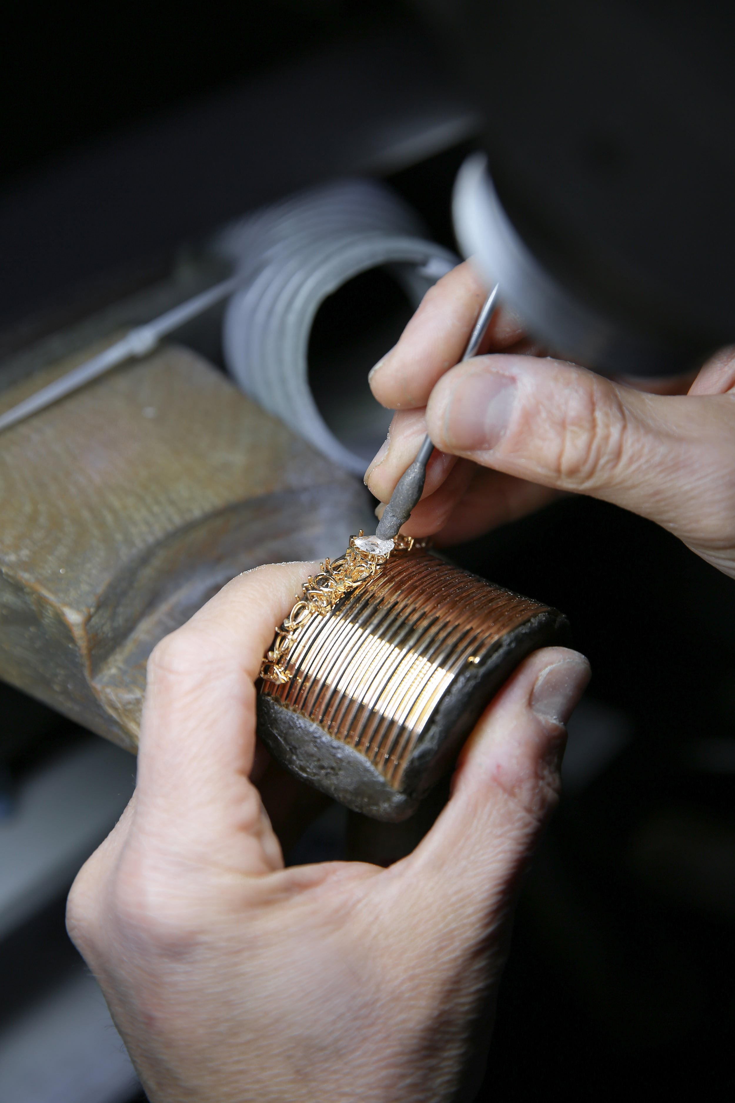 Le collier Plastron est la pièce maîtresse de la collection. Cette pièce d'exception résulte d'un processus d'assemblage méticuleux, démontrant le fil d'or caractéristique tout en assurant un confort remarquable et une tenue parfaite sur le cou. Sa création a nécessité 250 heures de travail de la part de l'atelier.